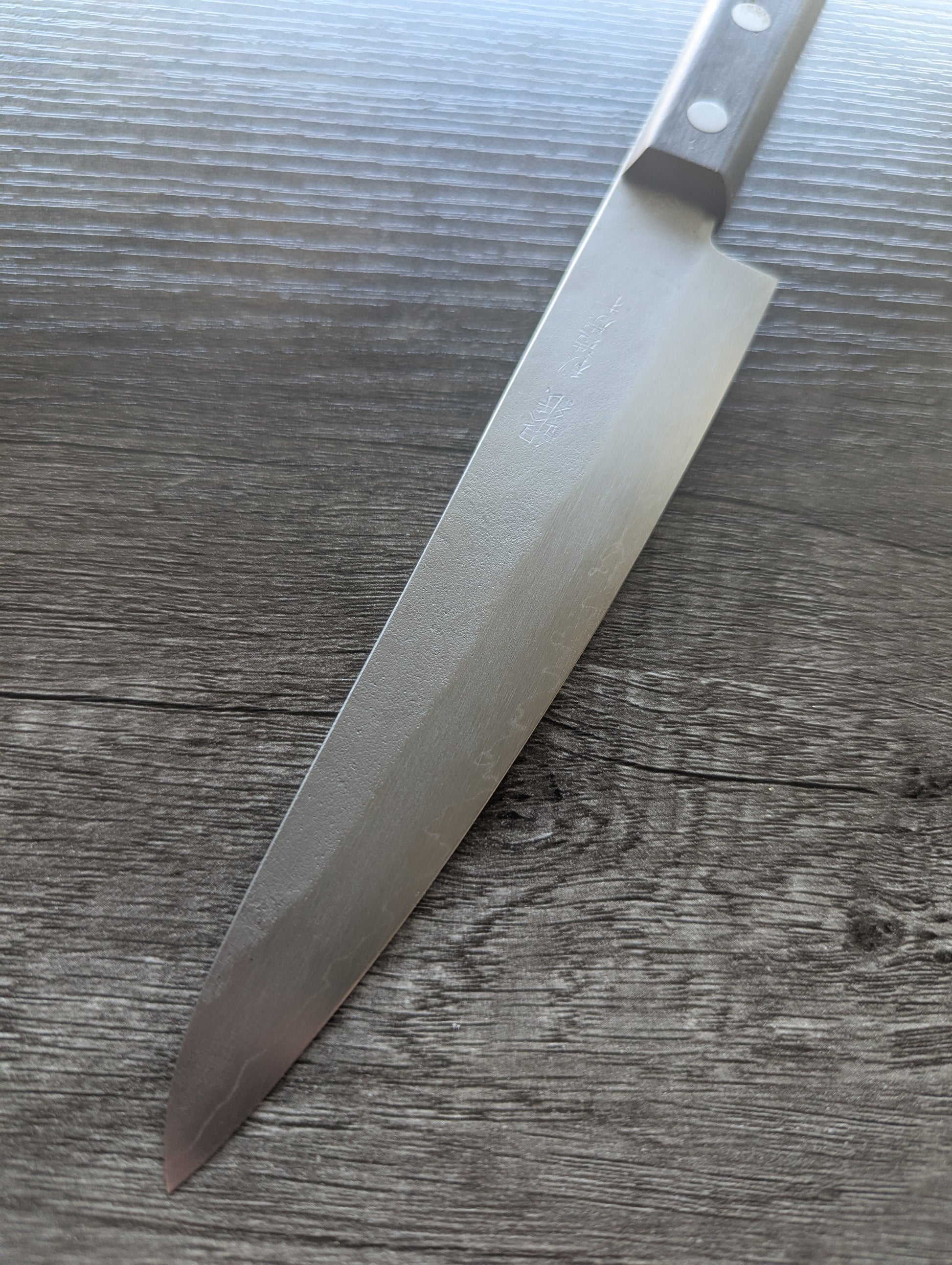Stamped with 銀紙鋼 (Ginsan steel) and 秋弘作 (Akihiro saku), proudly signed by its maker. Ginsan (Silver #3) is a stainless steel loved by Japanese smiths for its fine grain, excellent edge retention, and sharpening ease — traits normally reserved for carbon steels, without the worry of rust.