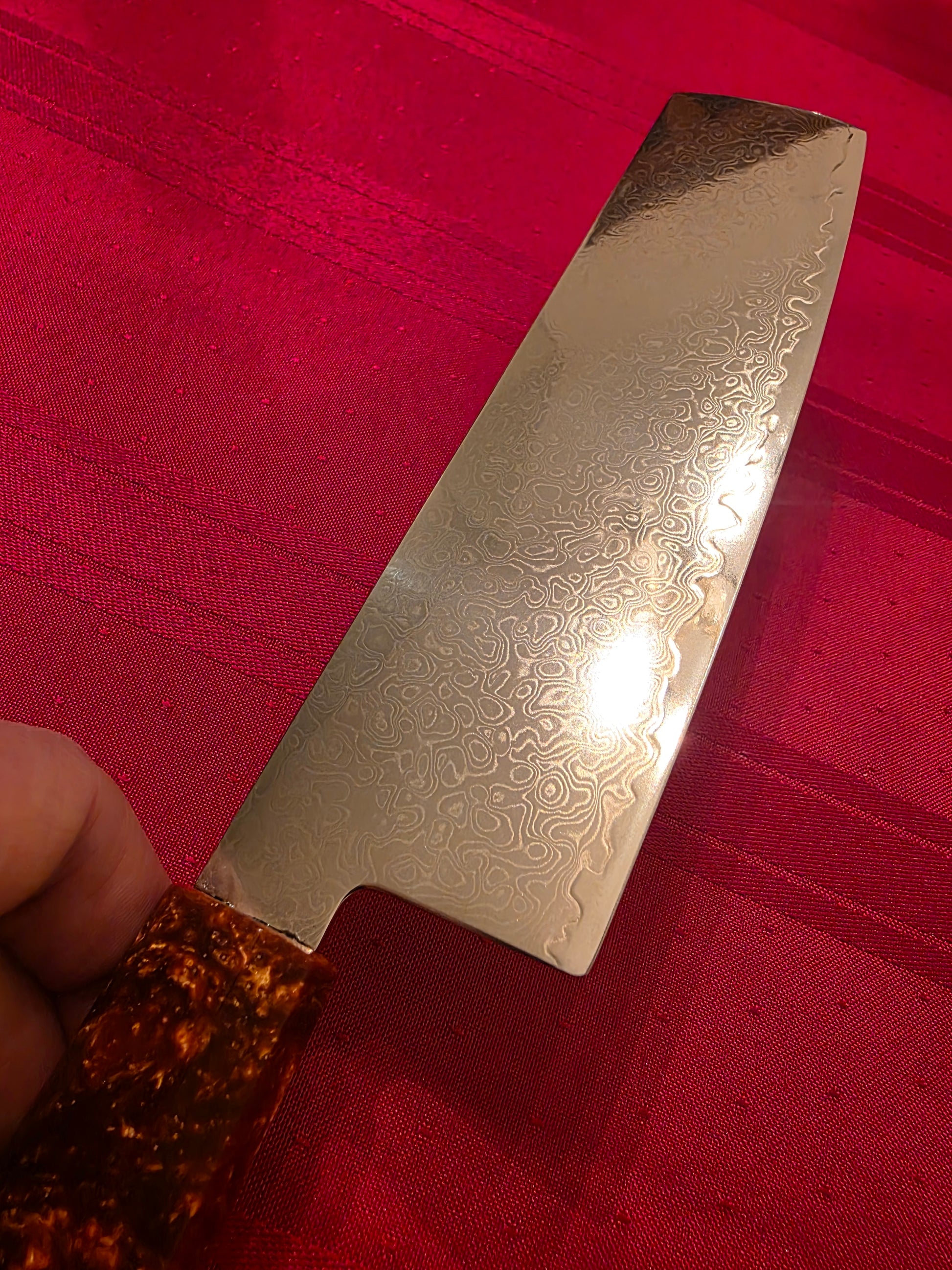A 180mm aus10 Damascus nakiri made in Seki, Japan, featuring 67-layer san-mai construction and a durable resin handle. Sharp, stainless, visually striking, and extremely practical — a workhorse vegetable knife with just enough flash.
