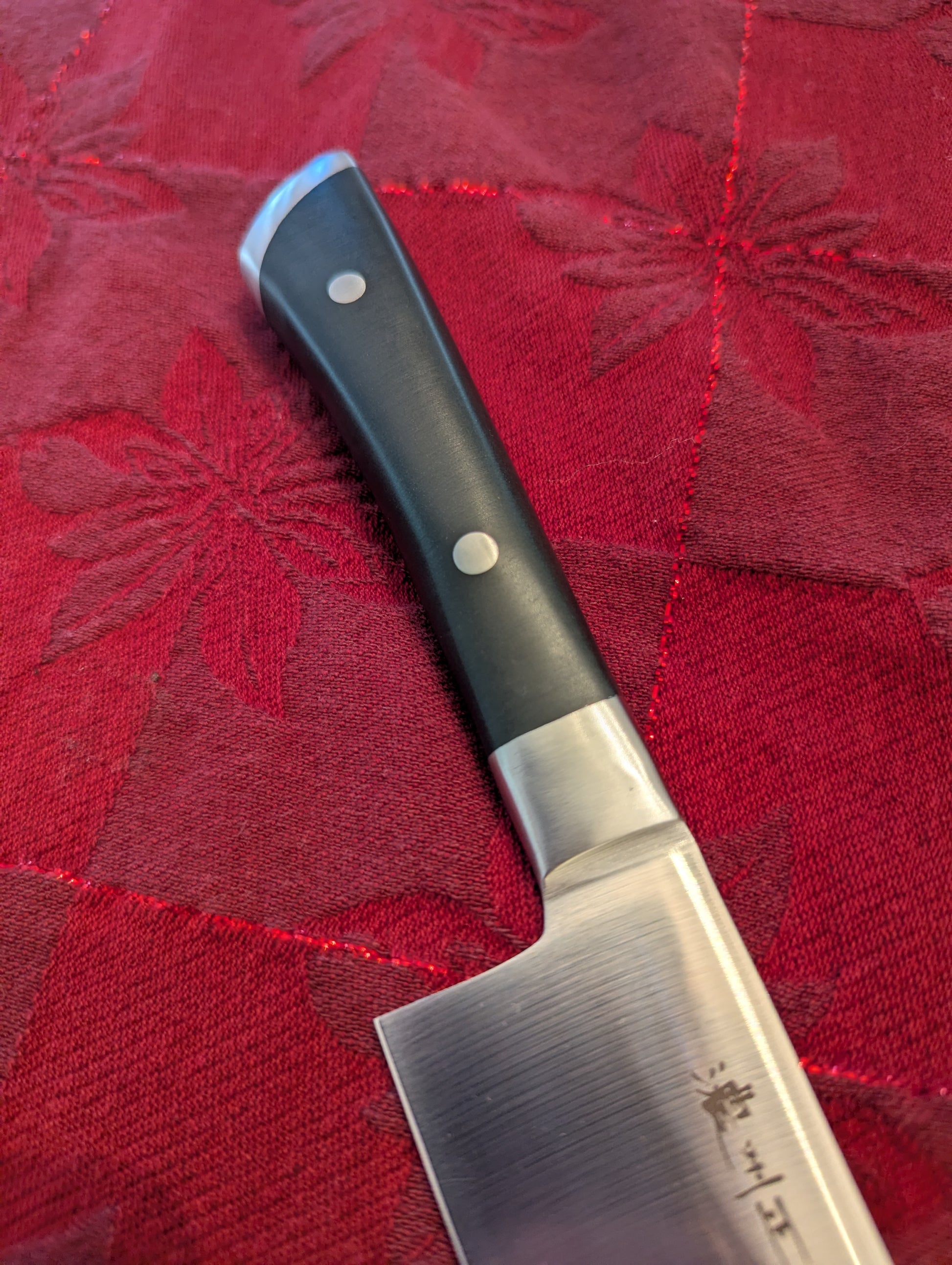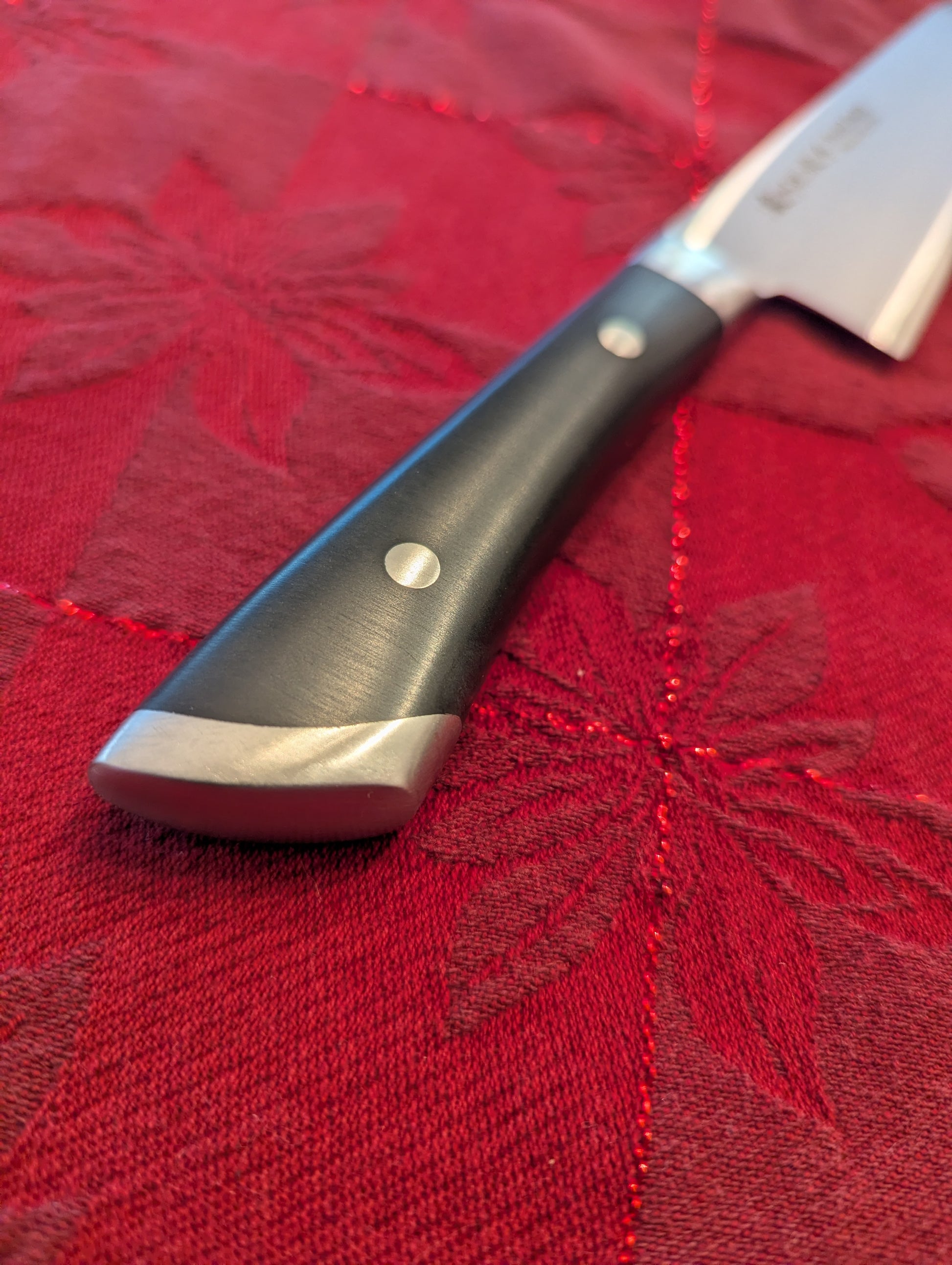 The blade features a slim, gently tapered profile that offers an excellent balance of cutting performance and durability. At 158g, it’s light enough to feel agile in hand, yet substantial enough to inspire confidence on the board. The grind is thin enough for smooth slicing while still robust enough for everyday kitchen tasks.