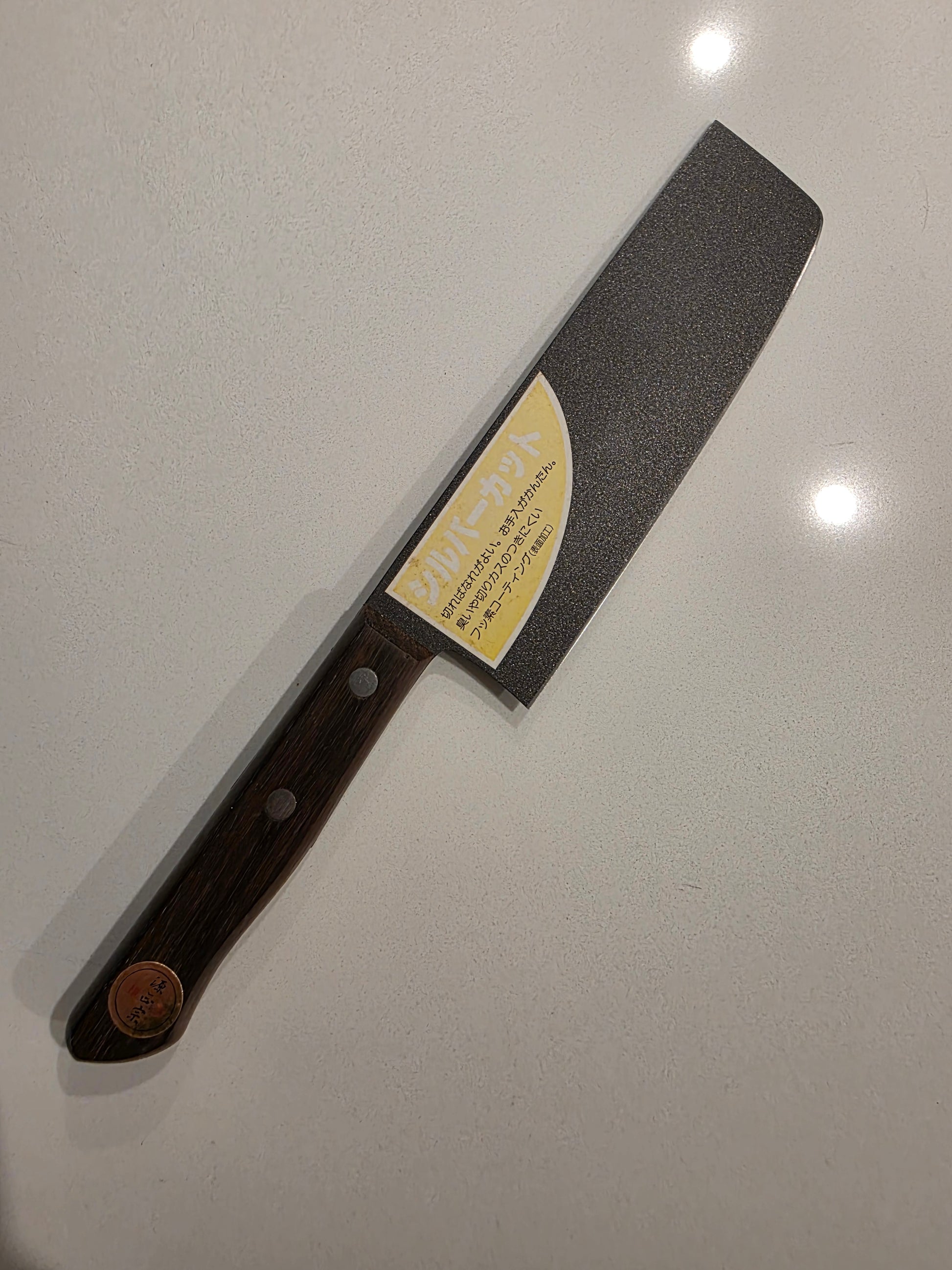 If Batman had a mid-life crisis and moved to a cabin in the Okanagan to start a vegan meal-prep business, this is the knife he’d use. This is a New Old Stock (NOS) Silver Cut Nakiri, featuring a matte black non-stick finish that makes "stealth" look like an understatement. It’s sleek, it’s square, and it’s about as reflective as a black hole.